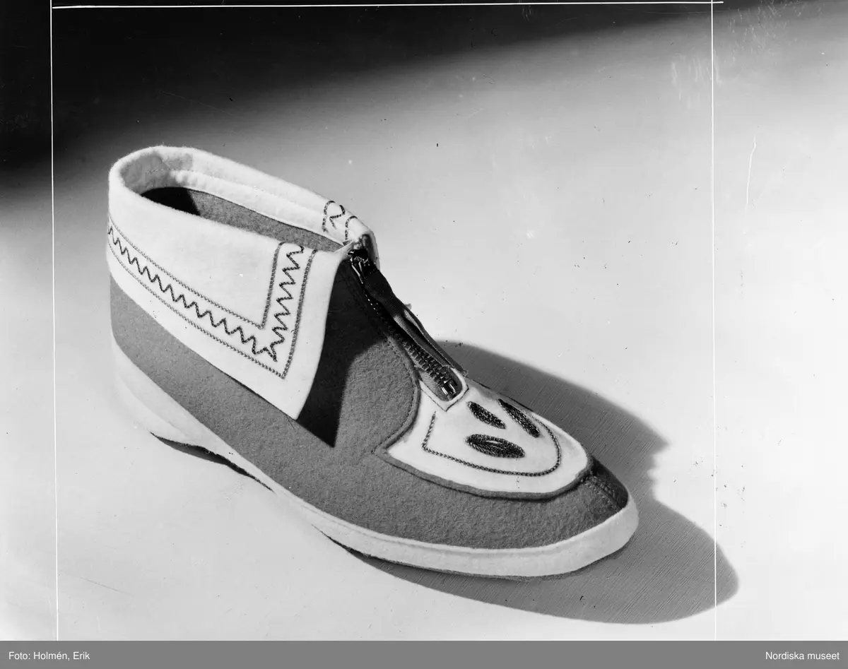 En toffla i vit och grå filt med vit krage, broderier och blixtlås.