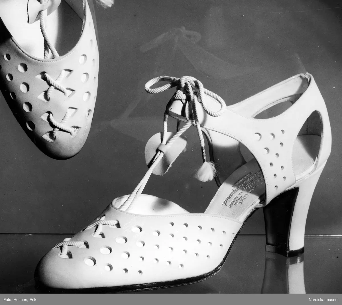 Sommarskor av vit numbuck, genomperforerade med snoddknytning på vristen.