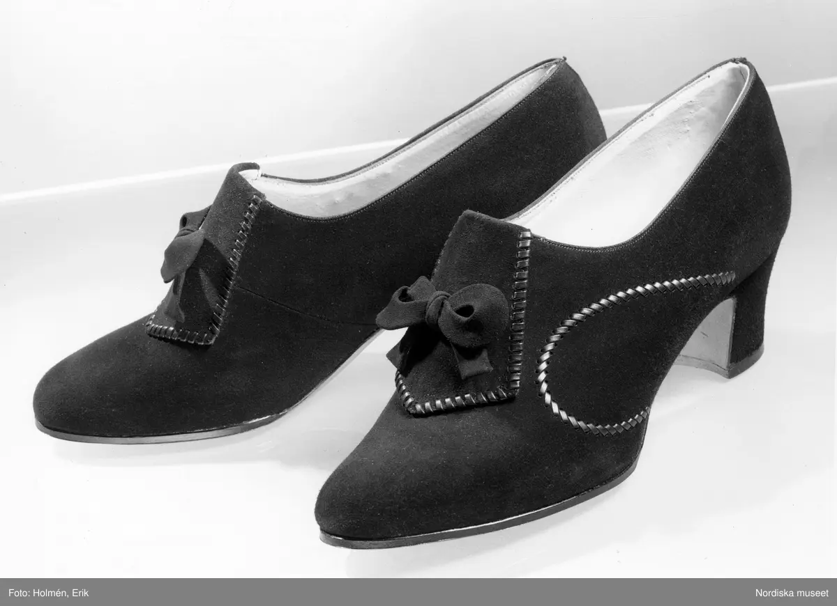 Högskuren resårpumps av svart mocca med bandgarnerad plös och sidstycke.