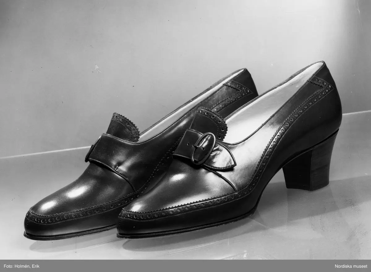 Promenadpumps av boxkalv i mahogny med rem och sölja.