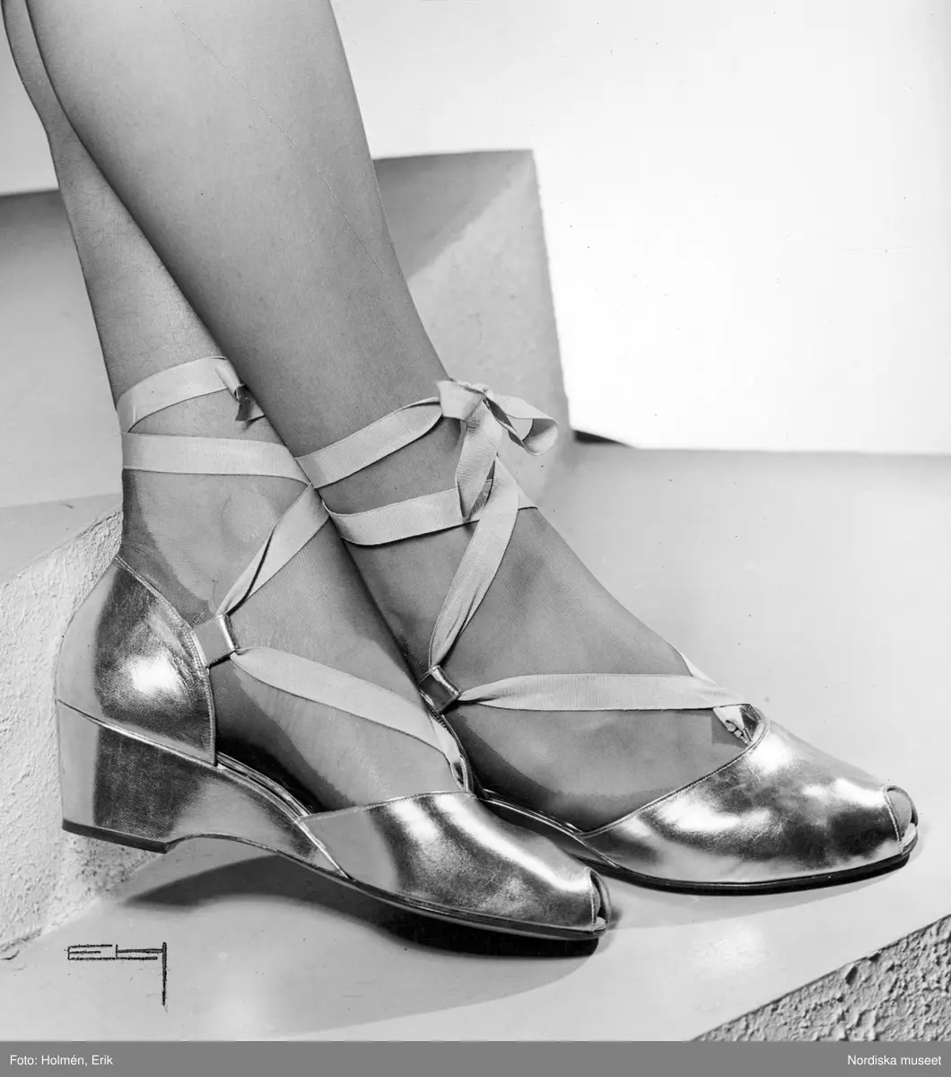 Aftonskor i guld/silver med ripsband knutna längs vristen.