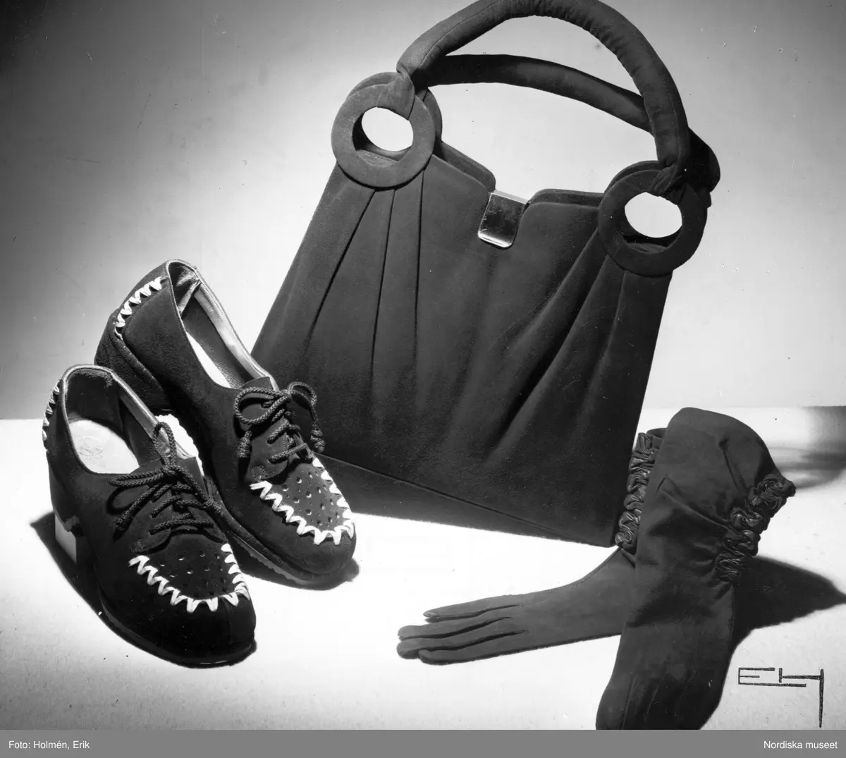 Ballyskor i blå boxkalv med vit gummisula, fransk moccaväska och moccahandskar med skrynklor i ena sidan.