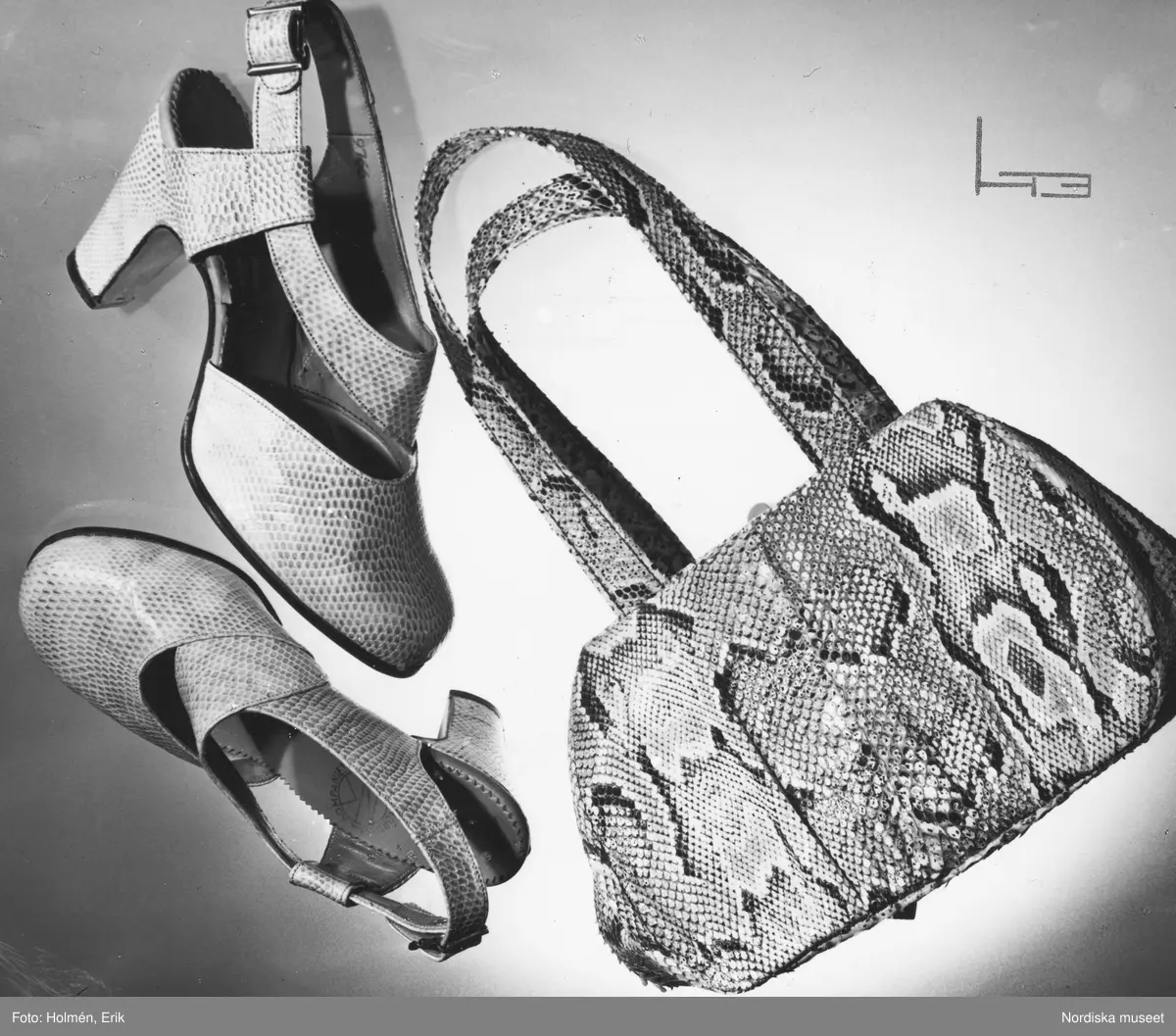 Väska i äkta ormskinn med skinnfoder och skor i ormskinn. Svensk tillverkning.