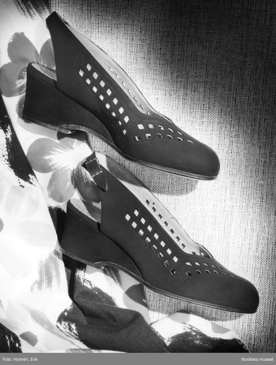 Skoutställning, Vår. Damskor med kilklack och mönstrad textil.