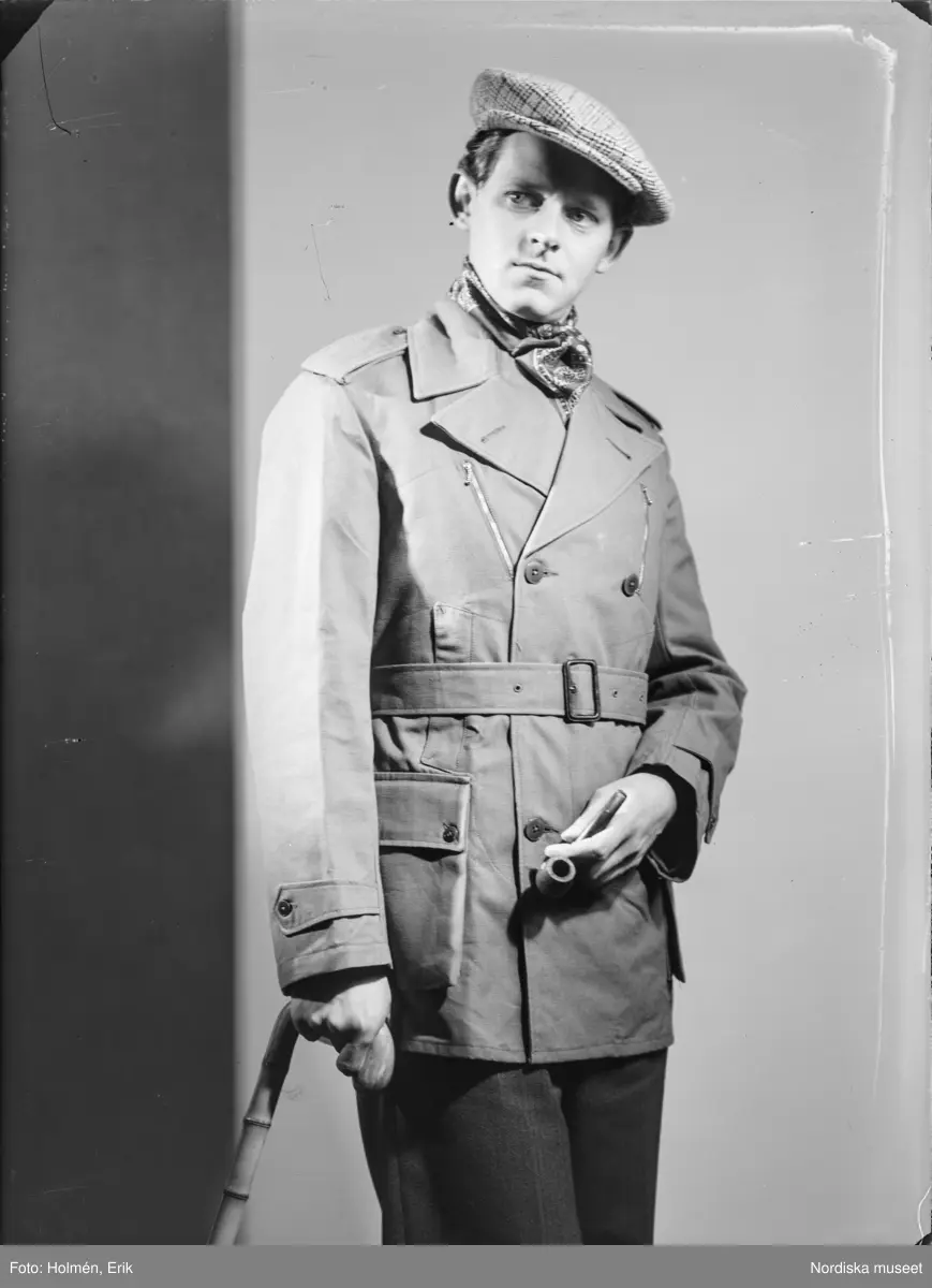 Kläder för friluftsliv. Man i jacka, keps håller käpp och pipa i händerna.