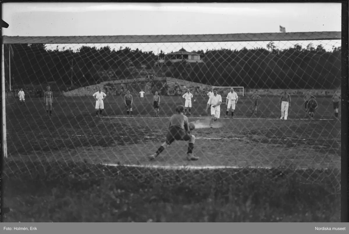 Fotboll. Match på Tranebergs IP. Skott på mål ses genom nätet bakom målvakten.