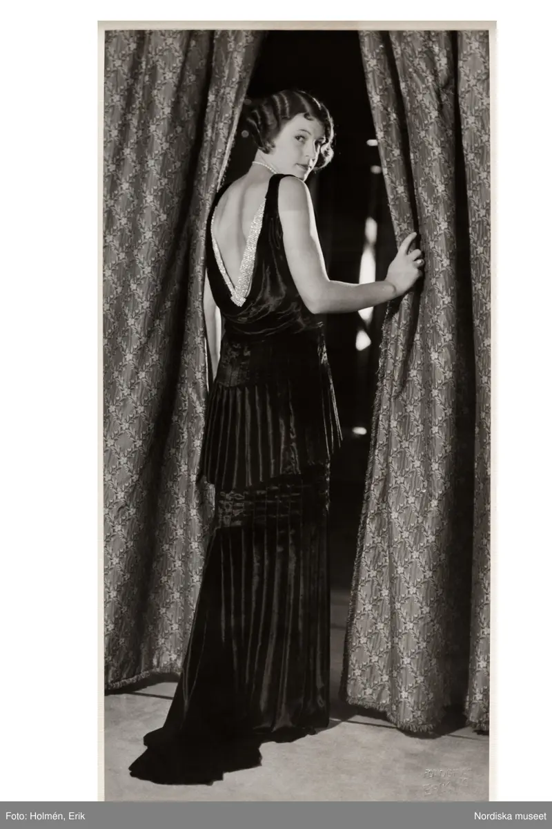 Mannekäng visar mode. Festklänning med ryggen i fokus, ärmlös klänning med urringad, draperad rygg dekorerad med glittrande tyg. Hellång med veckad skört och kjol med rak silhuett, litet släp. NK:s Franska damskrädder. hösten 1930i, från Jeanne Lanvin.