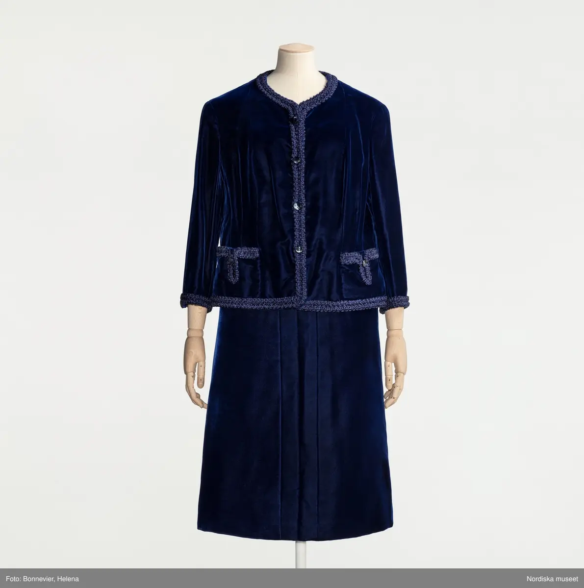Dräkt monterad på docka. Klassisk Chaneldräkt av midnattsblå sammet från NK:s Franska damskrädderi, efter ett original från Chanel. Beställd av prinsessan Sibylla (1908-1972), levererad november 1961. I Livrustkammarens samlingar, LRK_11893_11894.