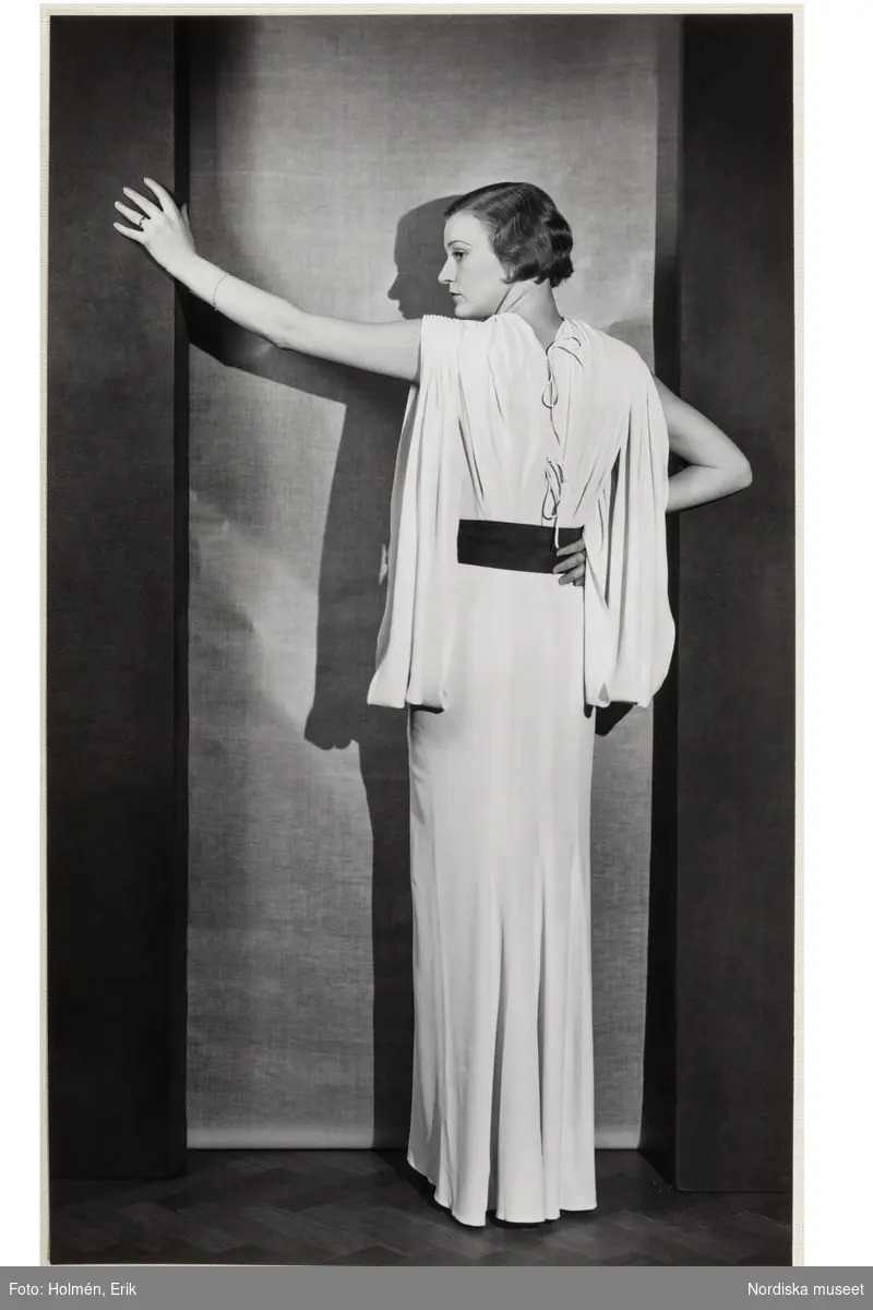 Mannekäng visar festklänning med ryggen i fokus. Hellång klänning med kort, draperad ärm, snörning i ryggen och brett skärp i avvikande färg. Hellång kjol med nedsydda veck. NK:s Franska damskrädderi.