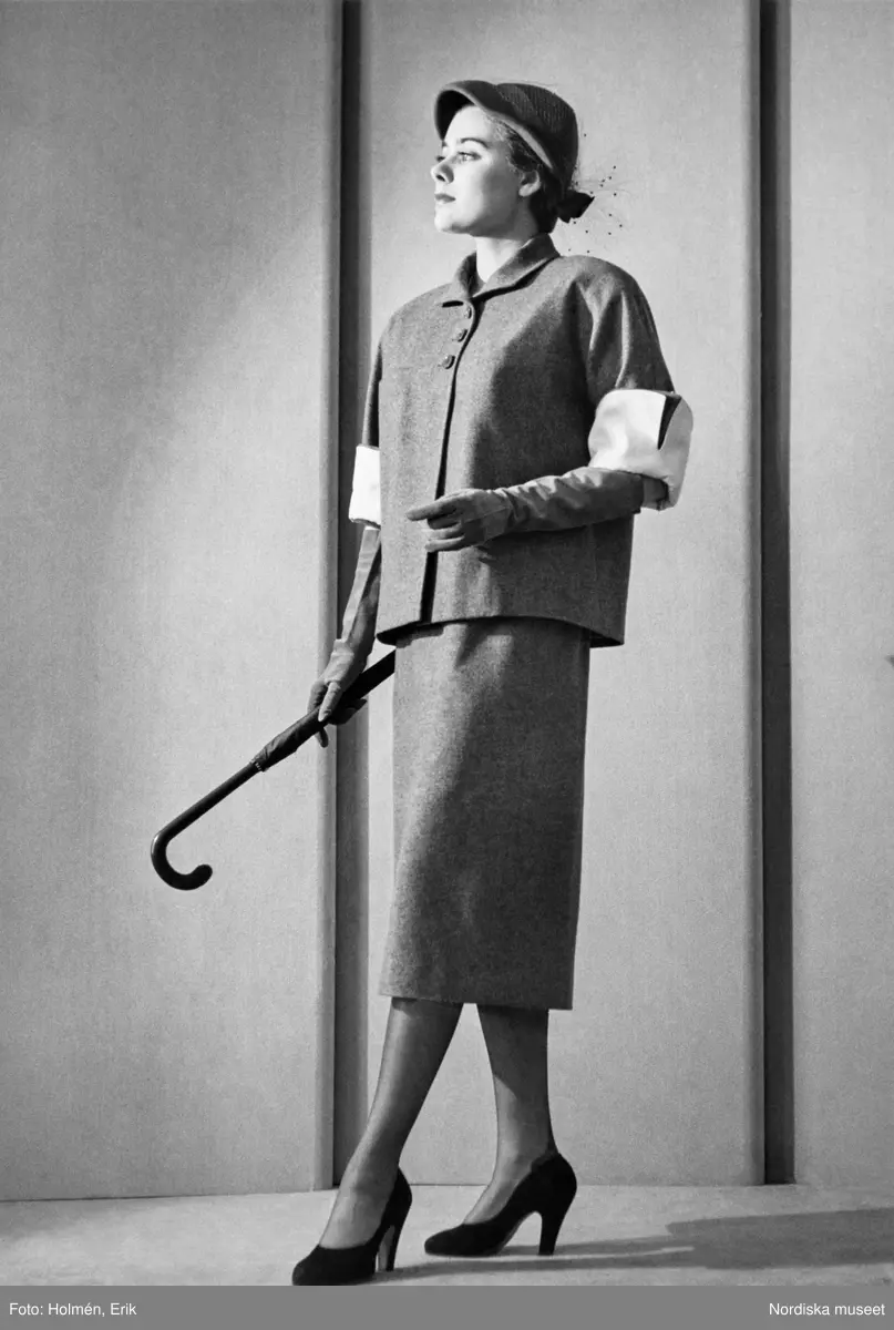 Mannekäng visar plagg i provrum. Dräktjacka, rak, höftlång med tre knappar, liten krage och armbågslång ärm med uppvikt manschett i avvikande färg. Vadlång pennkjol. Hatt, långa handskar, pumps med hög klack och paraply i handen. NK:s Franska damskrädderi, från Lanvin.