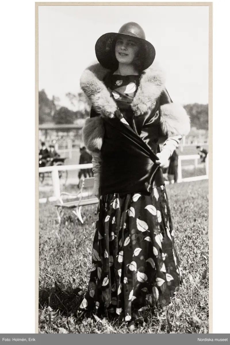 Mannekäng visar mode vid Ulriksdals galoppbana utanför Stockholm. Klänning av bladmönstrat tyg, ankellång kjol med vidd. Höftlång öppen jacka med pälskant nedtill och vid ärmsluten. Hatt. NK:s Franska damskrädderi.