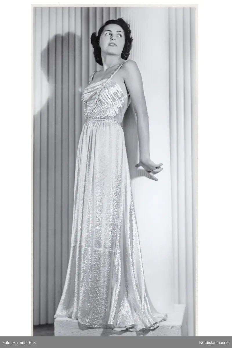 Mannekäng visar festplagg. Aftonklänning av blankt tyg, liv med tunna axelband och dekorsömnad, markerad midja, hellång, något utställd kjol. NK:s Franska damskrädderi.