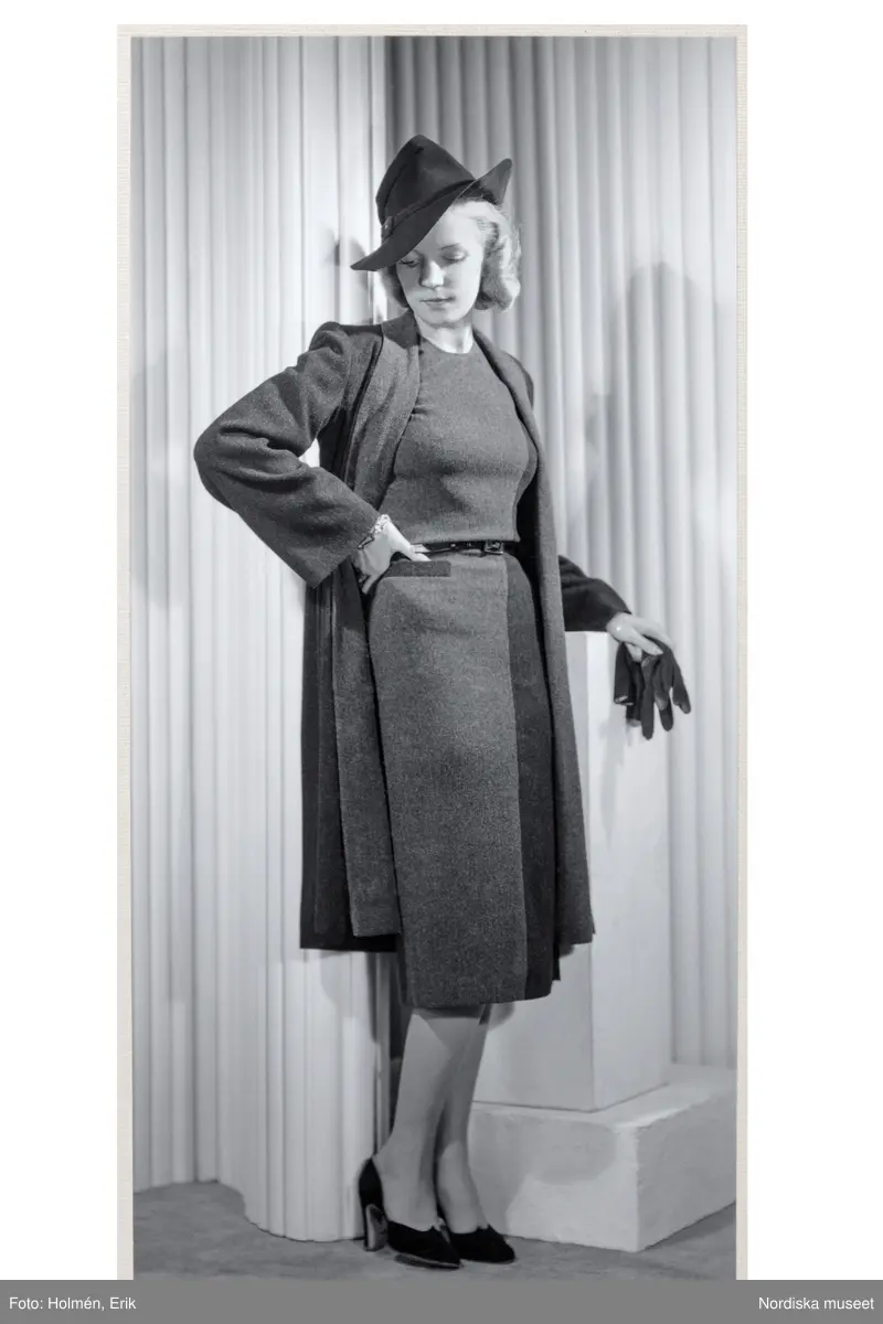 Mannekängen Margit Langlet visar höstplagg. Klänning med rund hals, skärp och knälång pennkjol med ficka vid höften. Kappa med sjalkrage. Hatt och högklackade pumps. NK:s Franska damskrädderi.