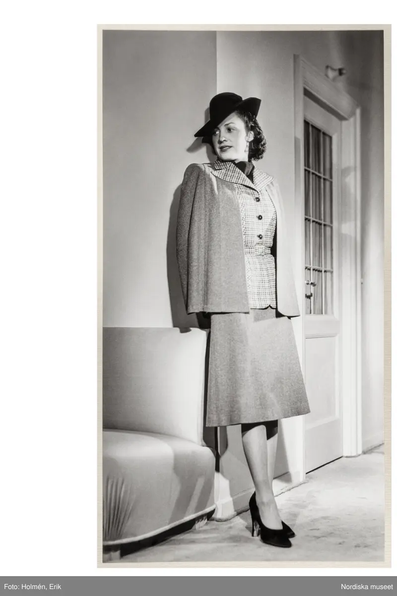 Mannekäng visar plagg i provrum. Tvådelad dräkt med rak höftlång jacka och svagt utställd knälång kjol. Under bär hon en smårutig jacka med stora slag, knäppning och skärp i midjan. Hatt och pumps. NK:s Franska damskrädderi.