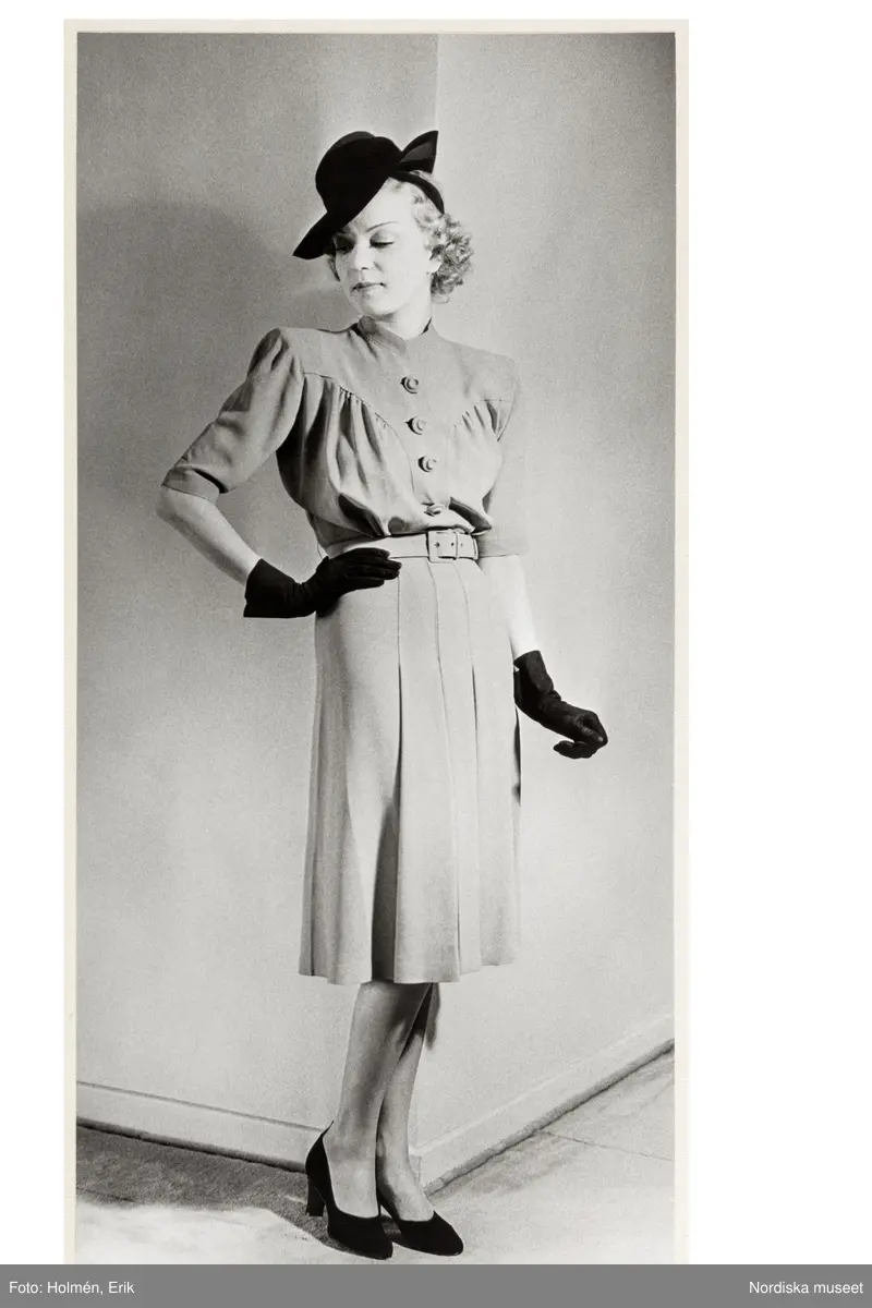 Mannekängen Margit Langlet visar plagg i provrum. Klänning med ståkrage, sytt ok och framknäppt liv. Armbågslång ärm och markerade axlar. Tygskärp med spänne. Knälång kjol med nedsydda veck. Hatt, handskar och pumps. NK:s Franska damskrädderi.
