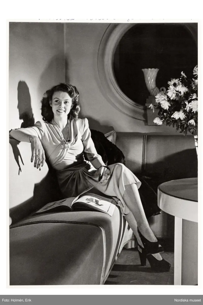 Mannekäng, Haide Göransson, poserar i soffa. Hon är iklädd klänning med markerad midja och lång ärm. Draperingar vid byst och midja. Hon bläddrar i en katalog, i ena handen en cigarrett. NK:s Franska damskrädderi.