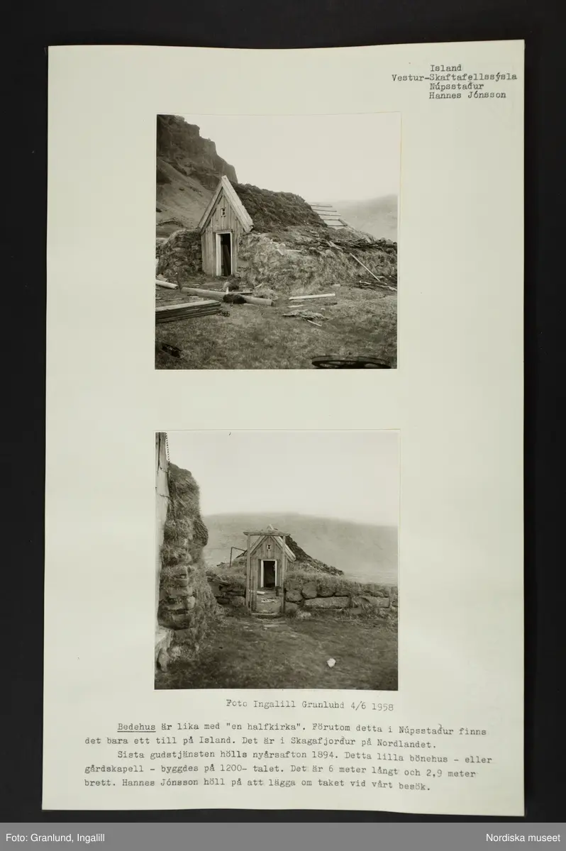 Ark med två monterade foton och text: "Bedehus är lika med "en halfkirka". Förutom detta i Núpsstadur finns bara ett till på Island. Det är i Skafafjordur på Nordlandet.