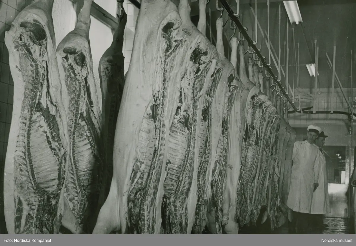 DUBBLETT Urtagna djurkroppar upphängda i rad på krokar. I bakgrunden två män i vita rockar.