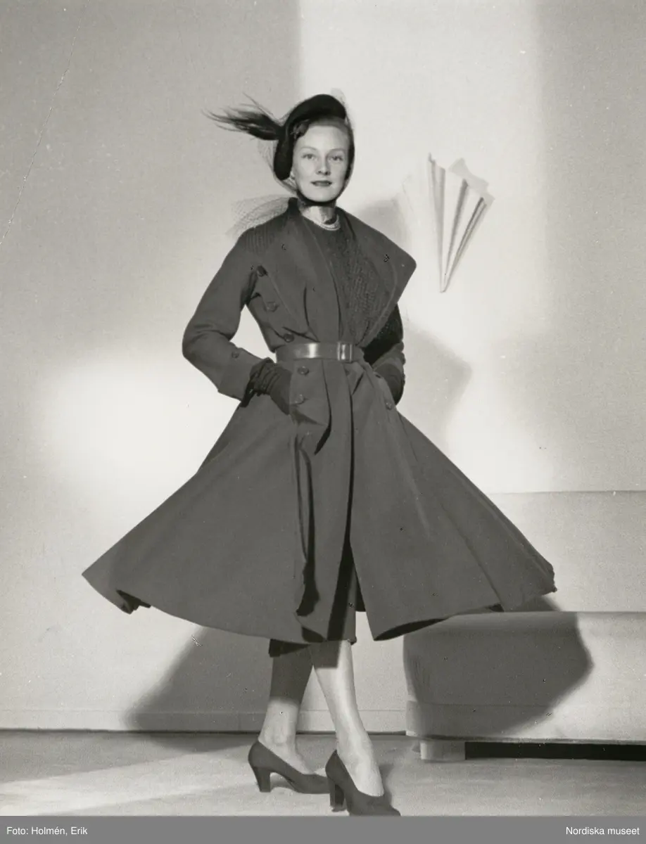 Nordiska Kompaniet. Kvinna i mörk, vid kappa med två rader knappar. Mörk hatt med flor knutet över. Text på baksidan: "Dior Mars 1949"