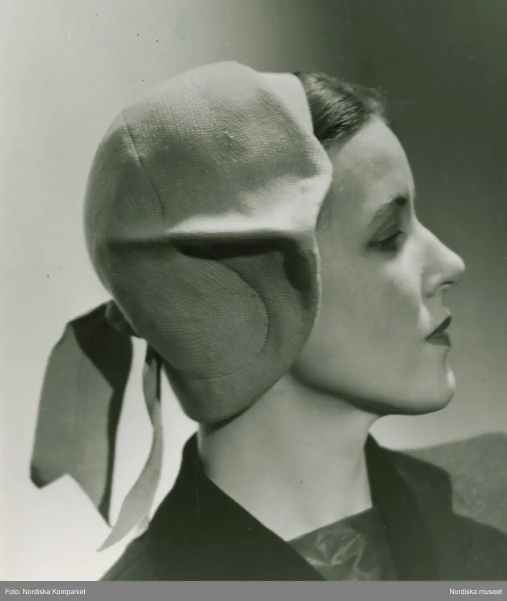 Porträtt av modell i citrongul stickad filthatt med dekorband i samma färg, av Jacques Fath.