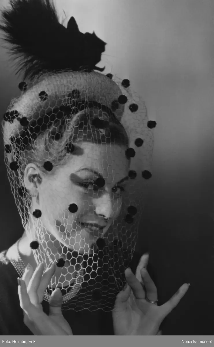 Modebild. Kvinna iförd liten hatt med fjäder och grovmaskigt flor som hon håller med båda händerna. På floret glest utplacerade stora moucher.