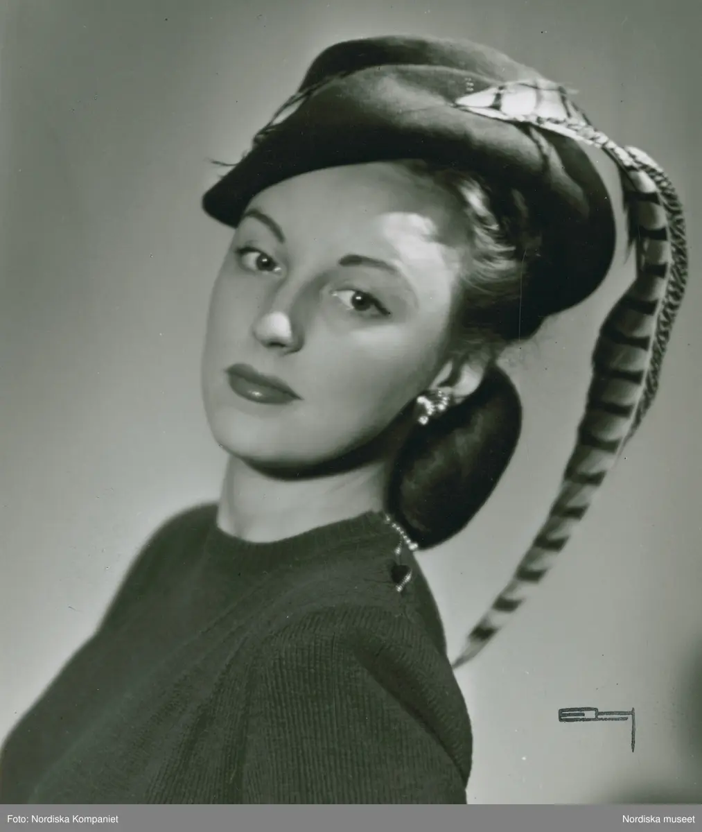Modell, möjligen Hjördis Grundel-Starenius, i hatt med kulle och uppvikt brätte. Lång fjäder trädd genom brättet, vid ena sidan.