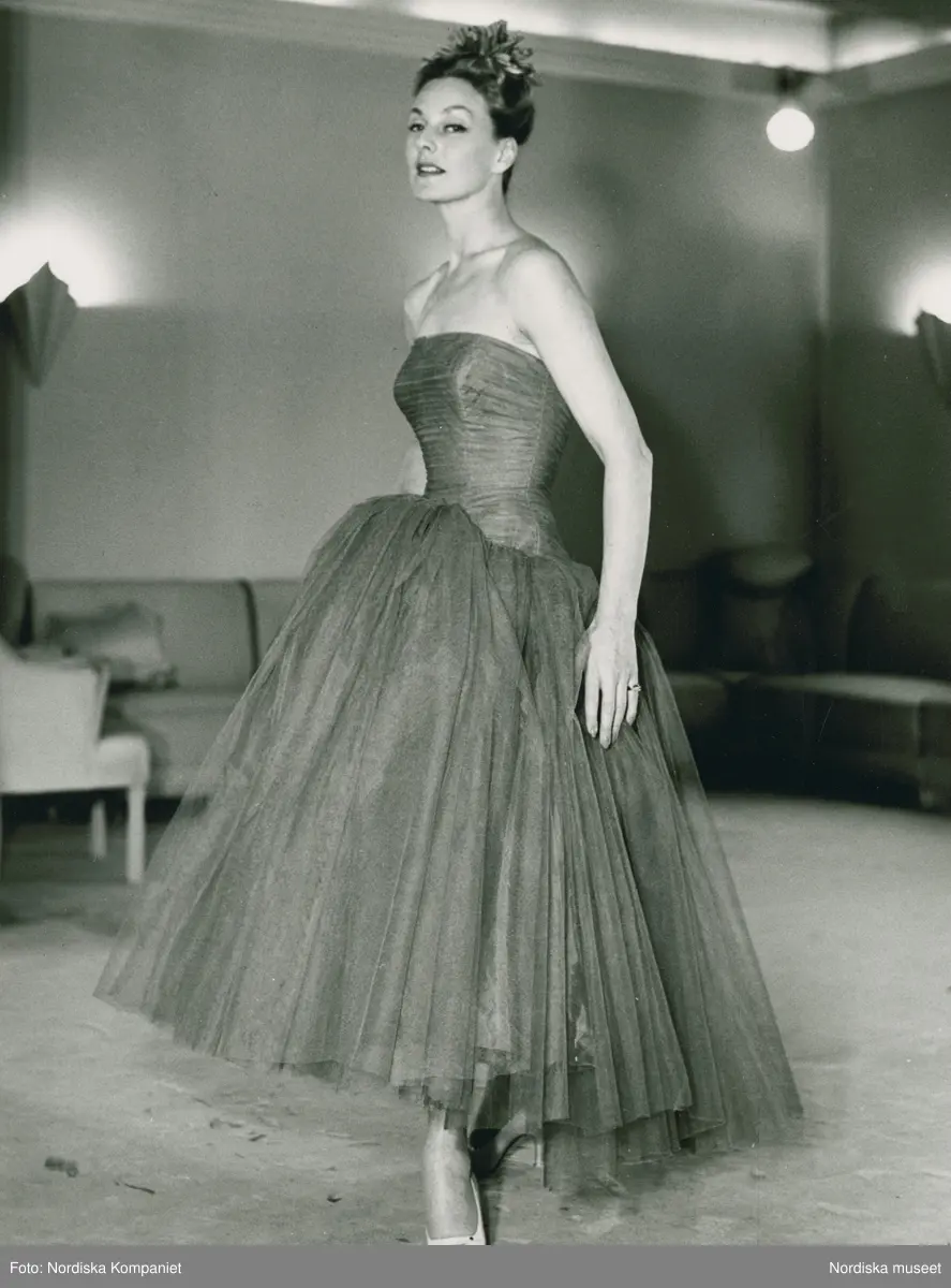 Modell i aftonklänning i tyll, fascinator och högklackade skor. Från NK:s Franska damskrädderi, efter Lanvin. Soffor i bakgrunden.