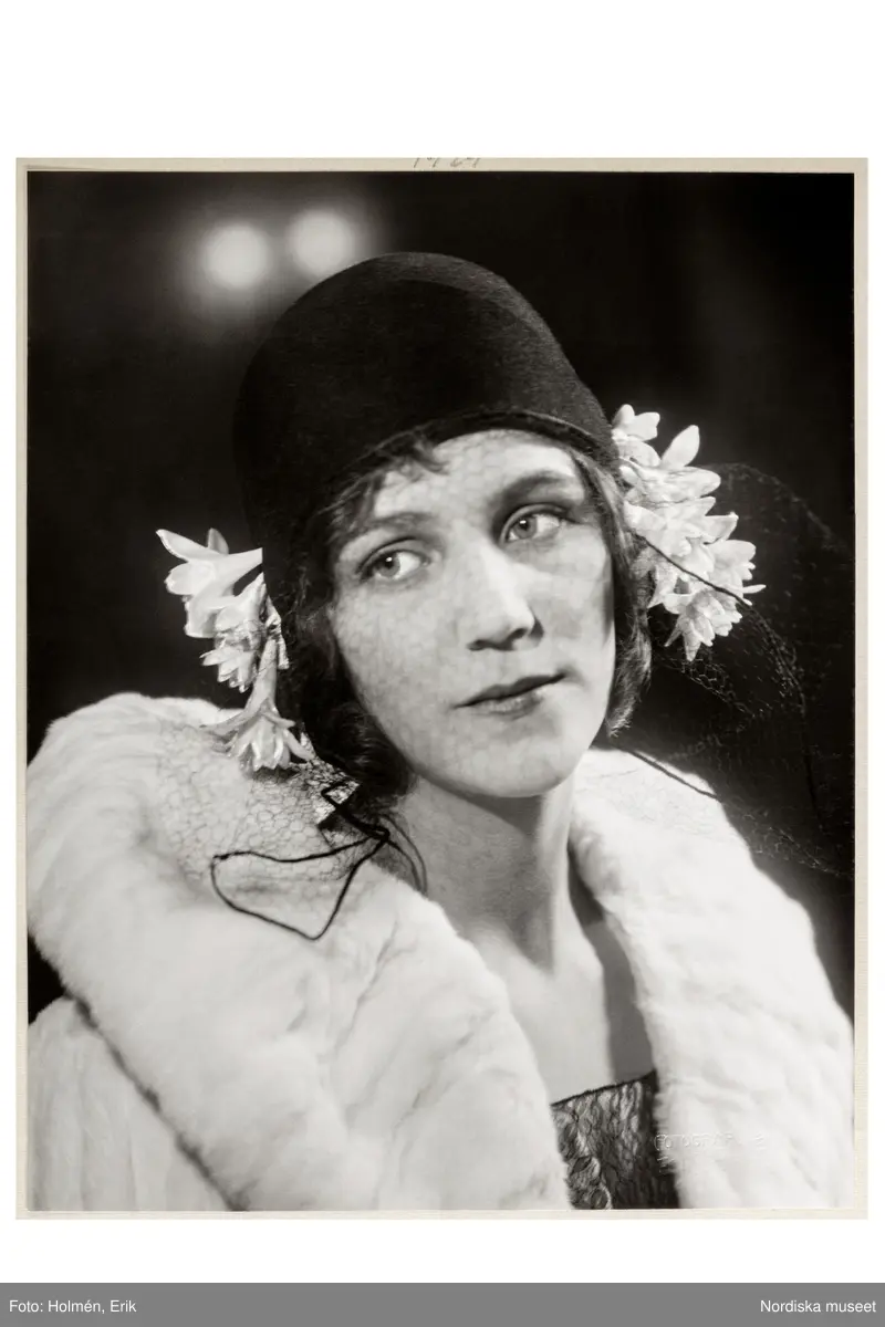 Mannekäng visar hattmode. Liten hatt utan brätten, med flor och en blomklase vid varje sida. Modellen bär päls med stor krage. NK:s Franska damskrädderi.