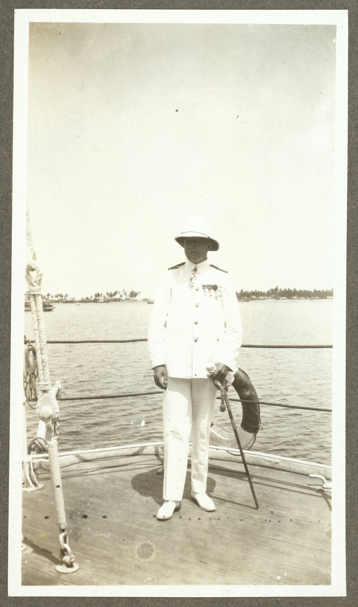 Bilden visar Fylgias Fartygschef John Eklund i paraduniform för tropikerna.