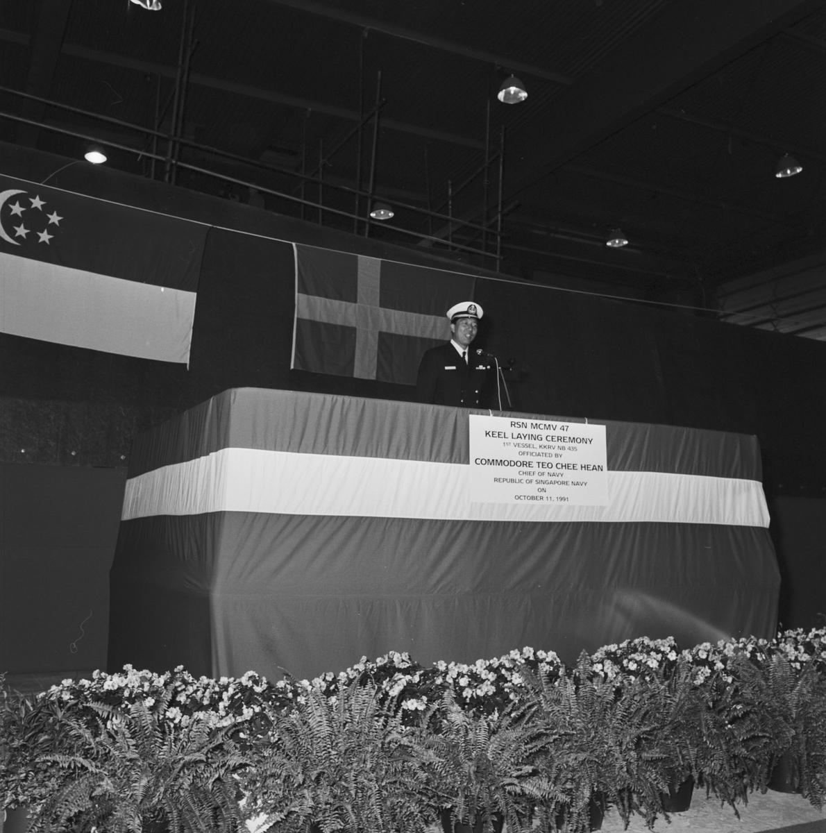 Bilden visar den singaporianske marinchefen som talar under ceremonin för kölsträckning av fartyget nr 435.