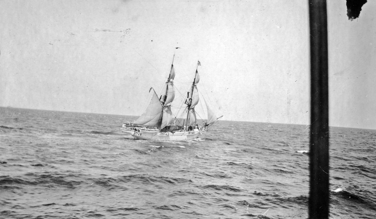 Briggen Falken till sjöss. Foto taget från annan båt.