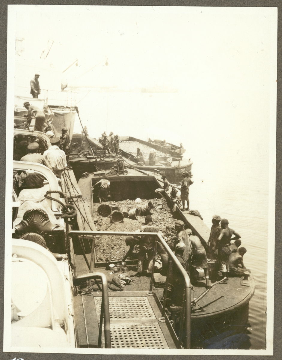 Bilden visar kolningen av Fylgia i Luanda. Tre lastpråmar ligger långsides och stenkol lastas ombord manuellt i korgar av svarta arbetare.