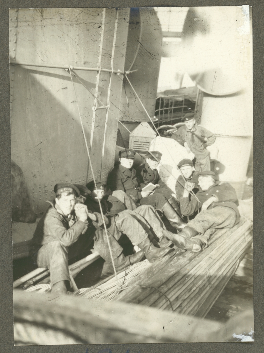 Bilden visar ett gäng skeppsgossar sittande ombord på Fylgia.