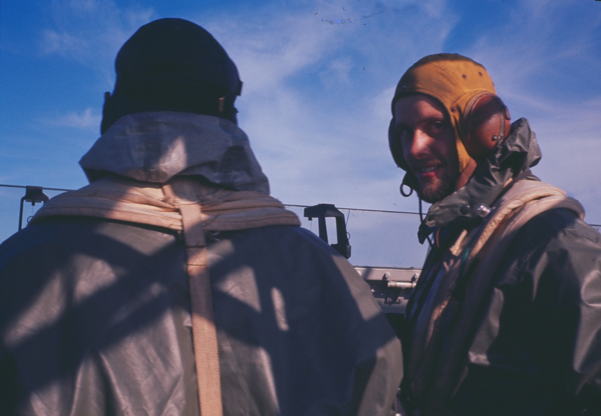 Bilden föreställer en porträtt av löjtn Törnvall med skyddskläder och flytväst ombord på en motortorpedbåt.