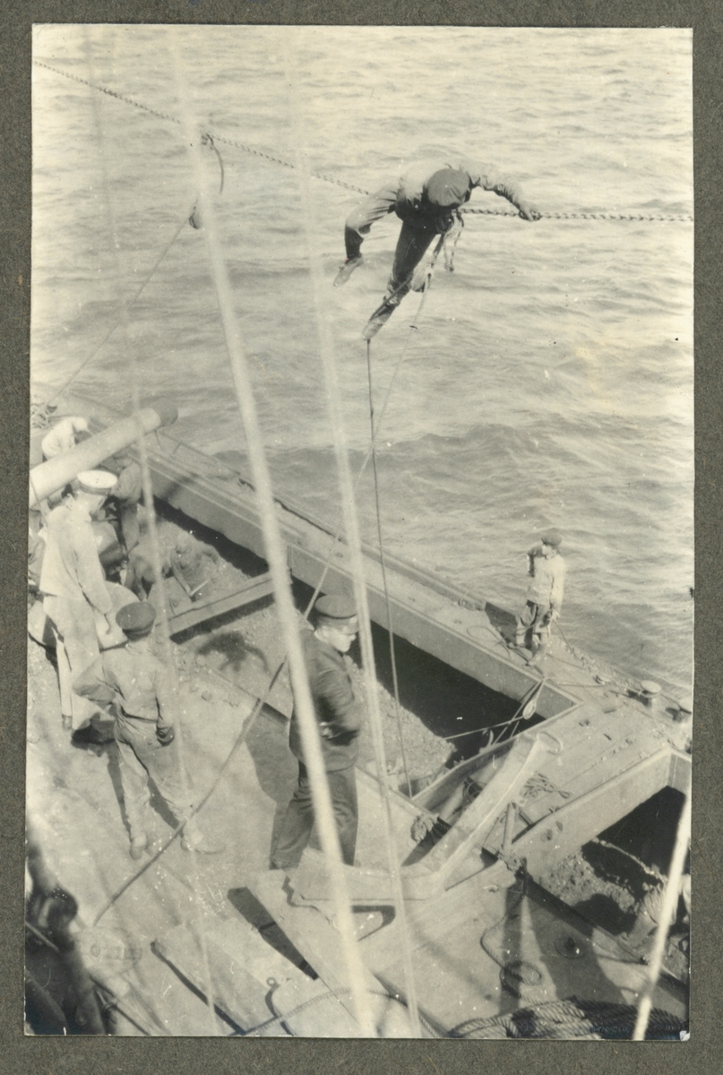 Bilden visar arbeten under kolningen av Fylgia. En man sitter på den rep högt över pråmen och förbereder en lyftanordning.