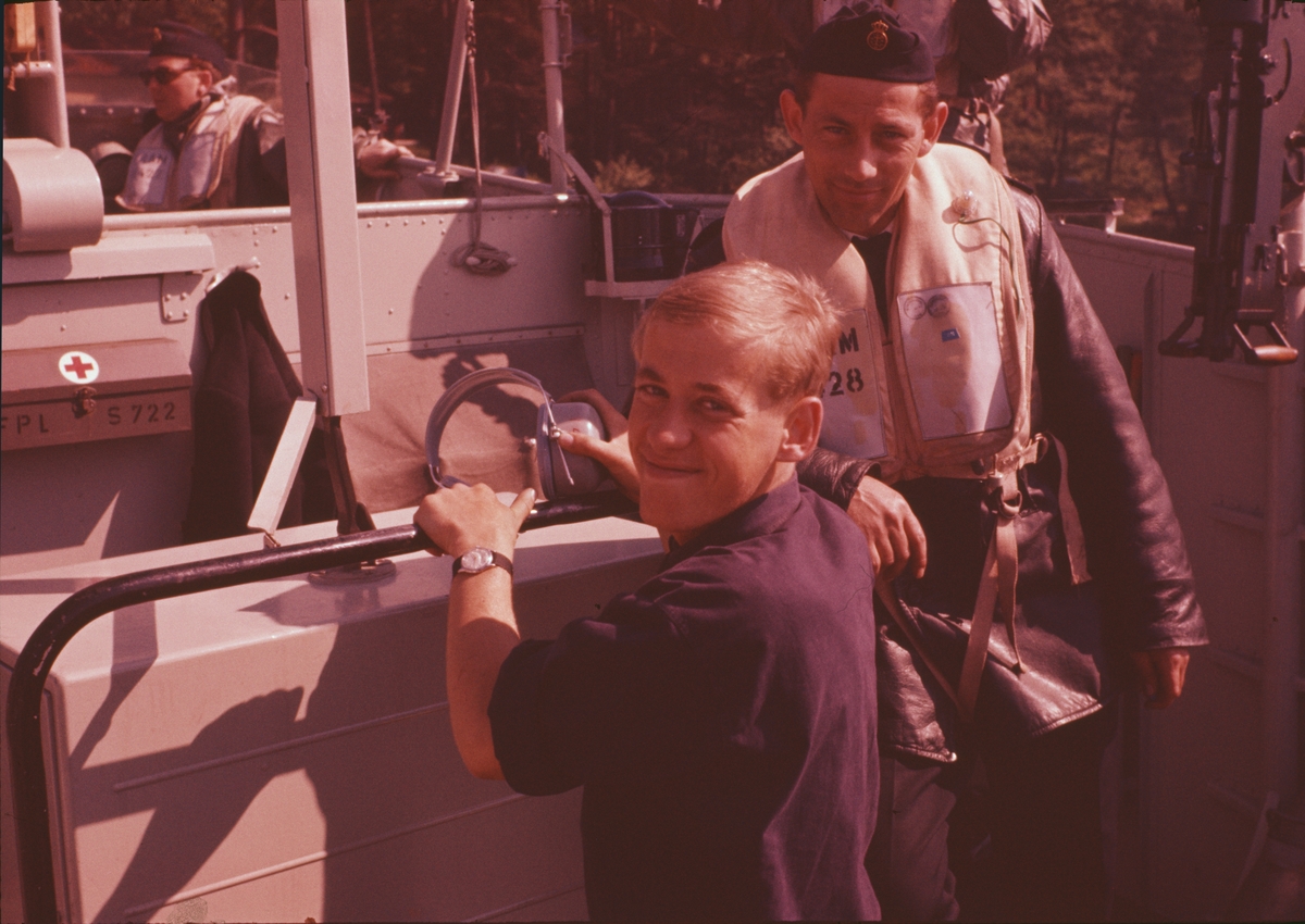 Bilden visar Bengt Persson och Andersson ombord på en motortorpedbåt.