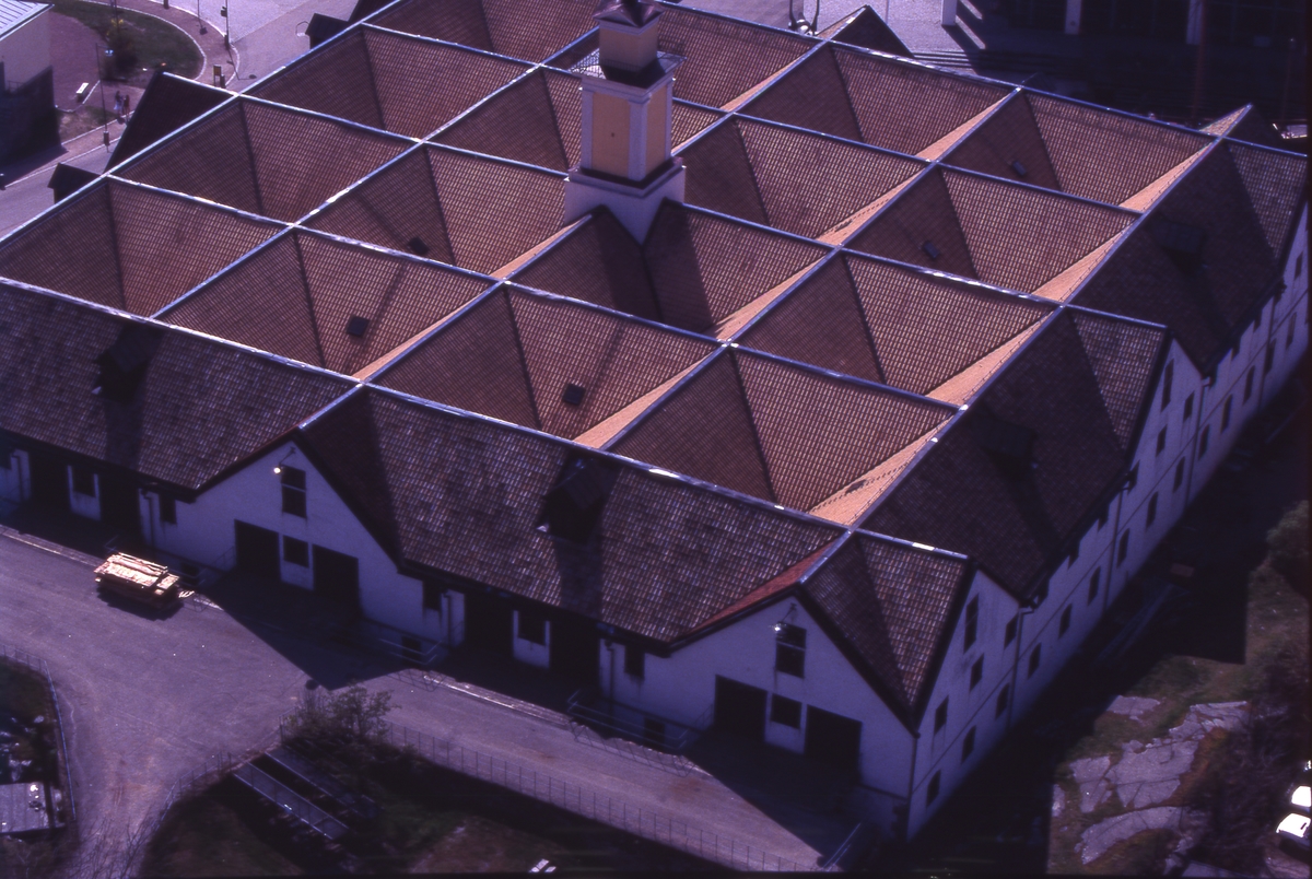 Flygbild över Stumholmen, taket på Slup & Barkasskjulet