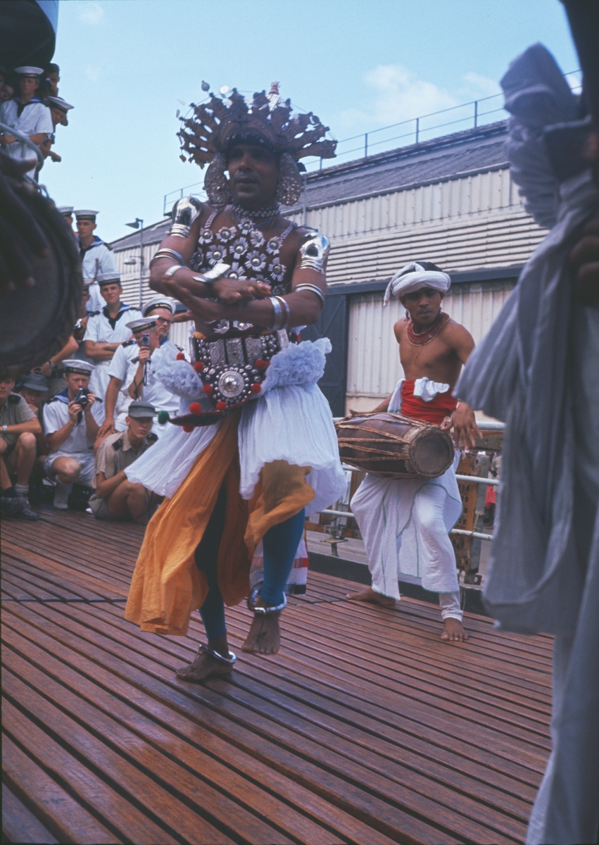 Bilden visar singalesiska dansare i traditionell kostymering som uppträder för Älvsnabbens besättning.