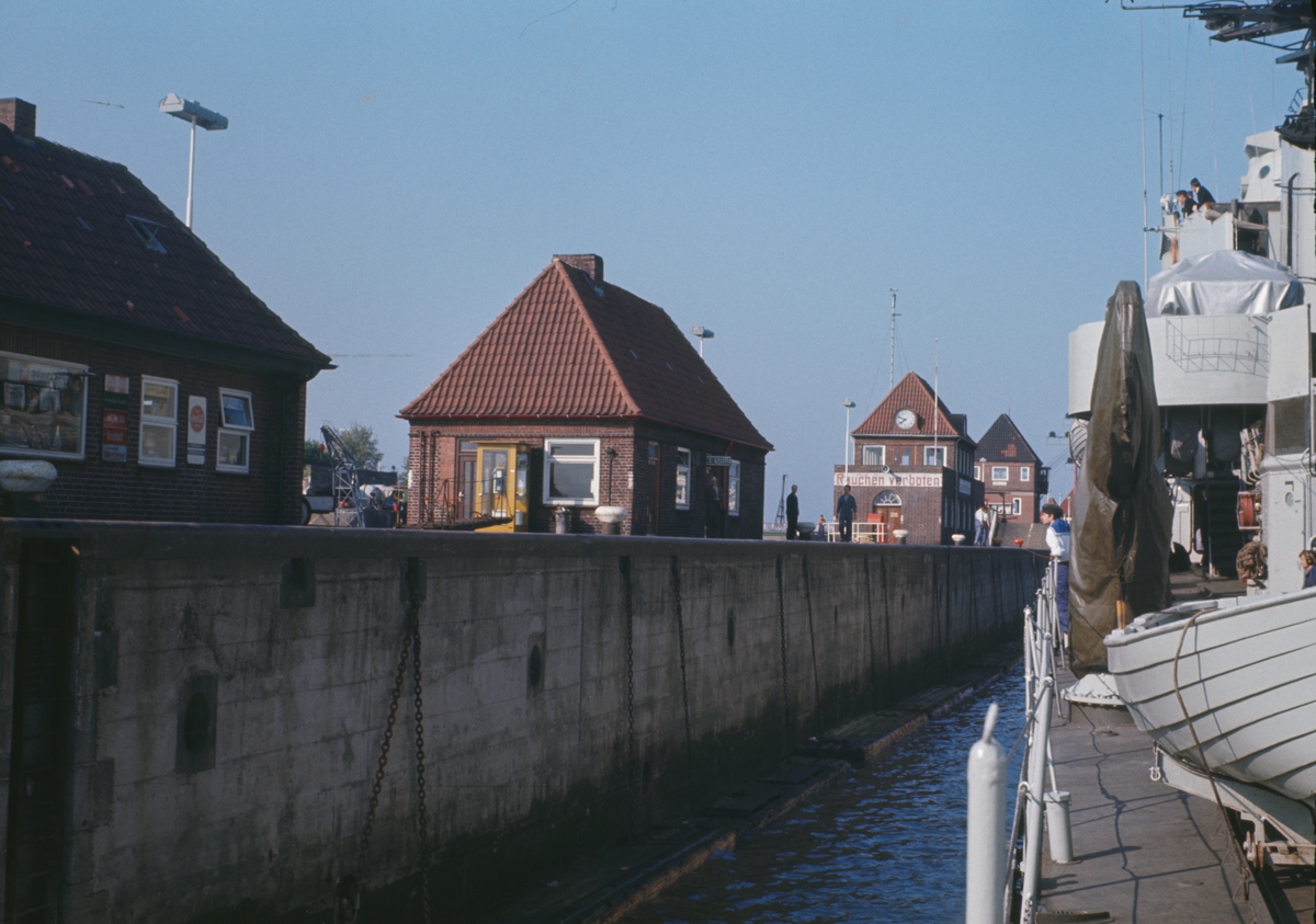 Bilden visar byggnader som ligger bredvid slussen i Brunsbüttel.