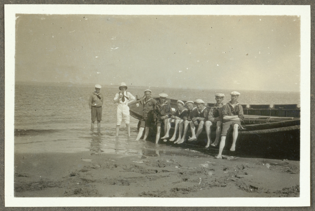 Bilden visar sjömän som sitter på en roddbåt vid stranden. De är barfotade och har samlats för en gruppfoto.