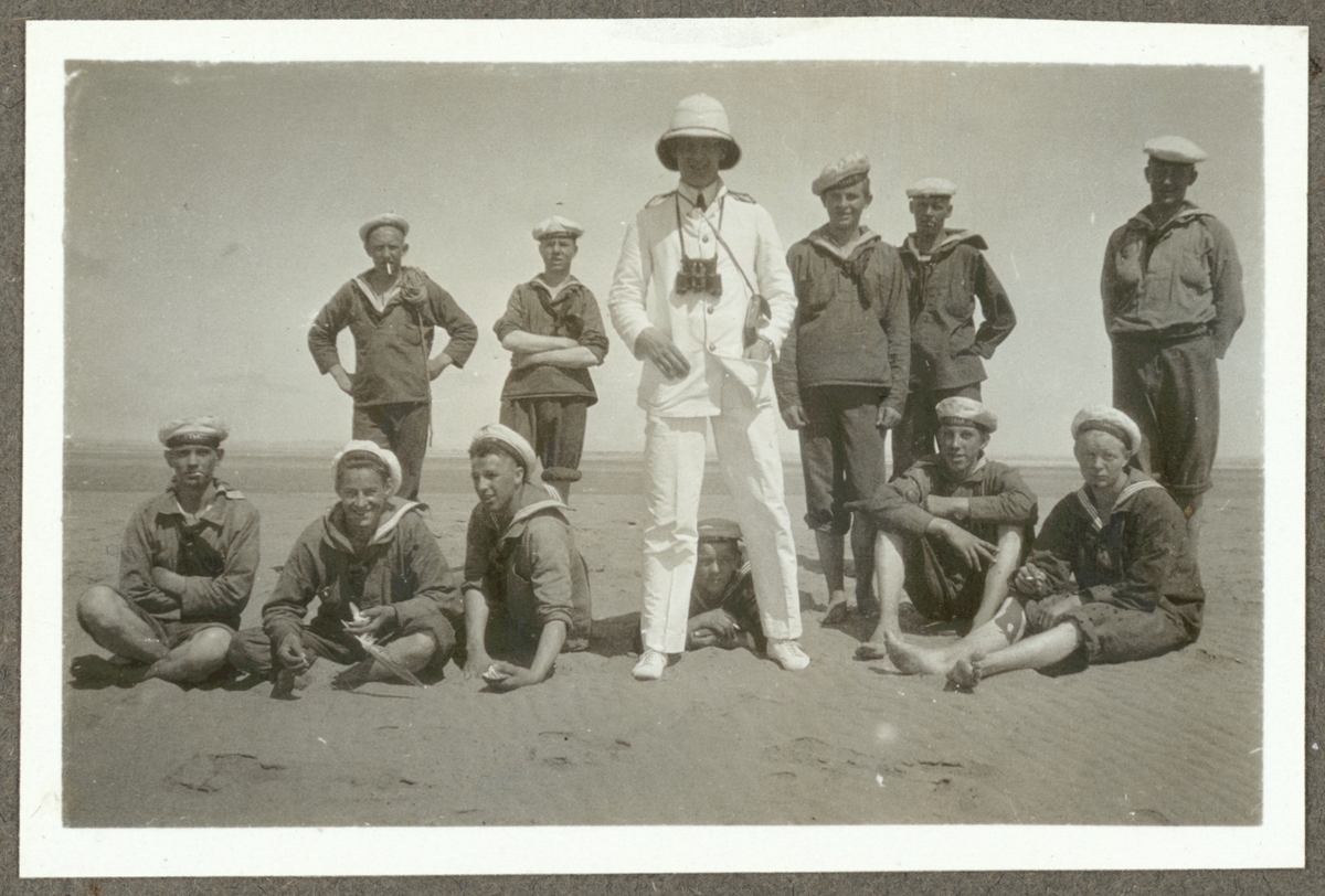 Bilden visar en grupp sjömän från fylgia som sitter barfotat på stranden av Pelican Point. De har samlats runt en befäl från fartyget för fotografering.