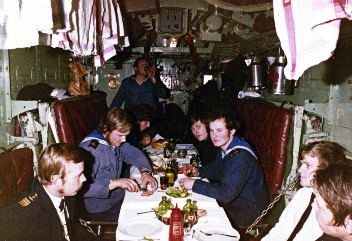 Middag på Makrillen. Längst fram till vänster Hbm Ingemar Edvardsson, andre man till höger radiotelegrafisten Hbm Roos.