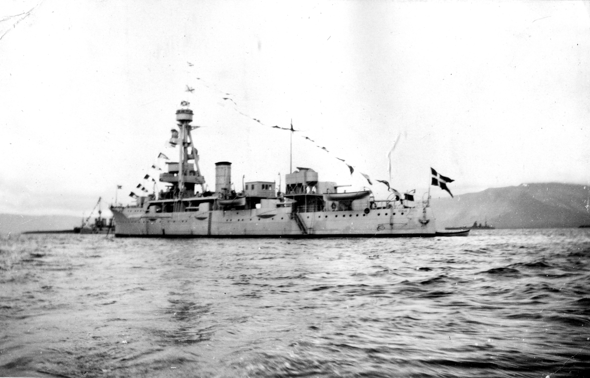 Danska pansarskeppet HDMS Nils Juel byggd 1923, bakom skeppet syns brittiskt slagskepp av Nelson-klassen