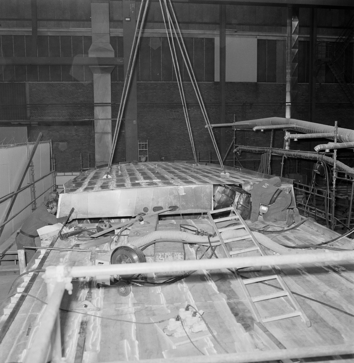 Lyft av förliga däcket till KBV 301 i flakhallen.