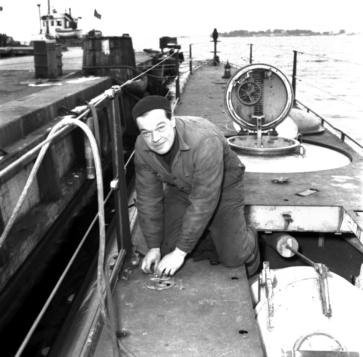 Plåtslagaren "Ragge" Karlsson håller på med restarbeten på den snart färdiga ubåten Valen, som var varvets 15:e ubåtsbygge och levererades till Marinen.