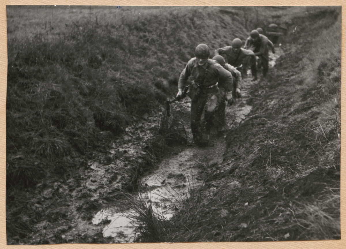 Bilden visar en grupp värnpliktiga som springer i en lerig dike.