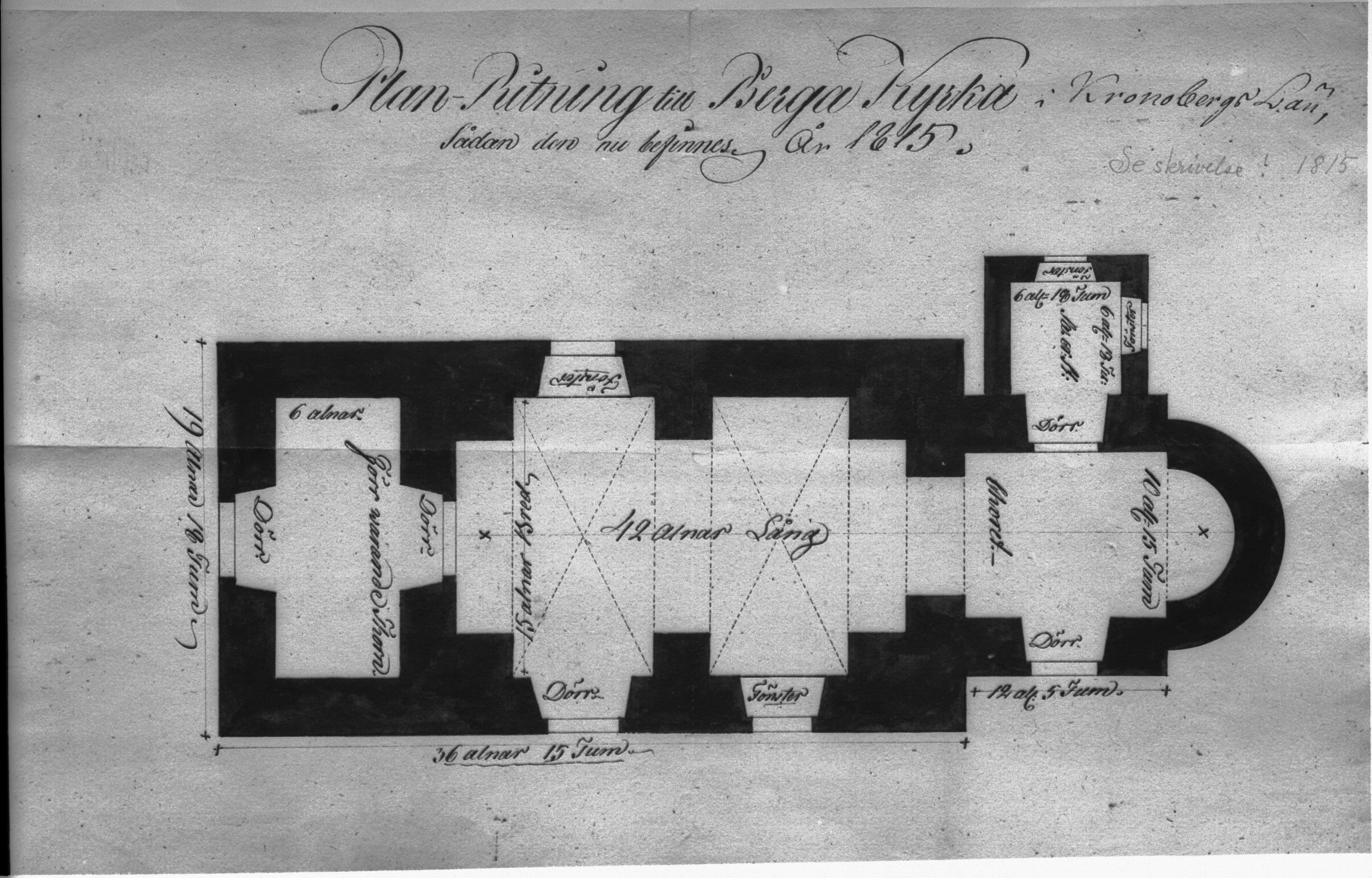 Foto av planritning över kyrkan. Från 1845. I Kungliga Byggnadsstyrelsens arkiv.