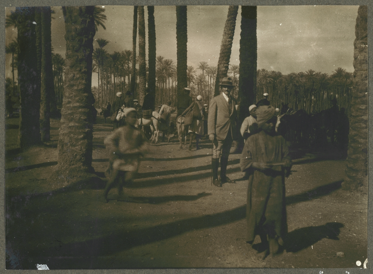 Bilden föreställer ett porträtt av en man i västerländska kläder som står bland palmer tillsammans med egyptier.