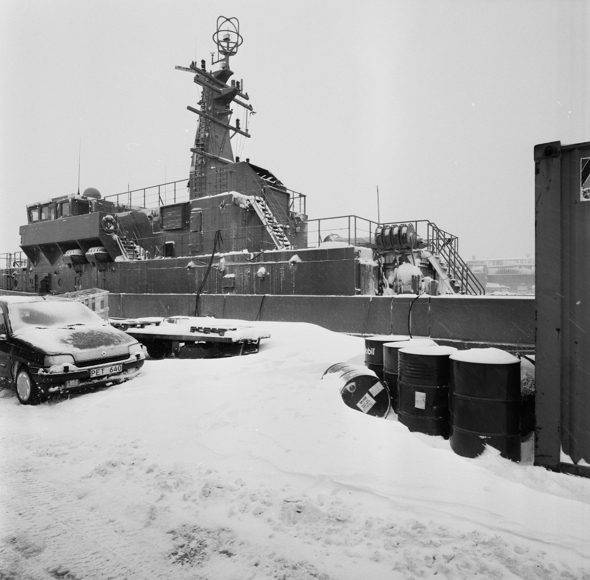 Fartyg i dockorna och vid kajerna snömotiv.