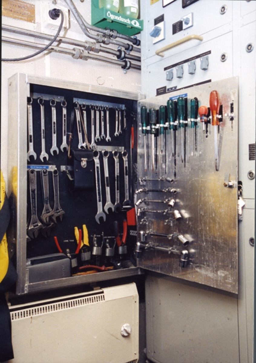 Vid nedgångslejdaren i maskincentral finns välfyllt verktygskåp
